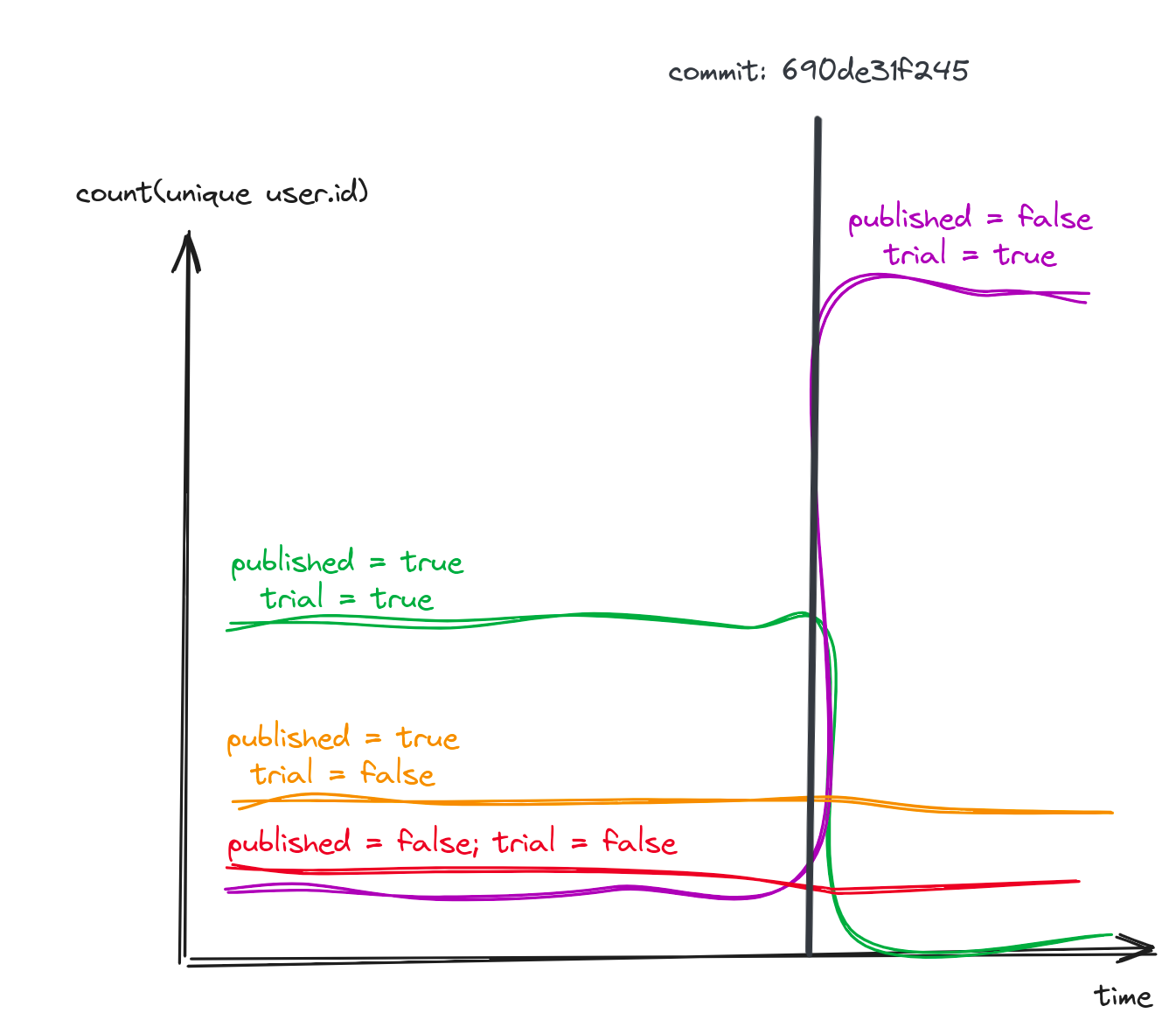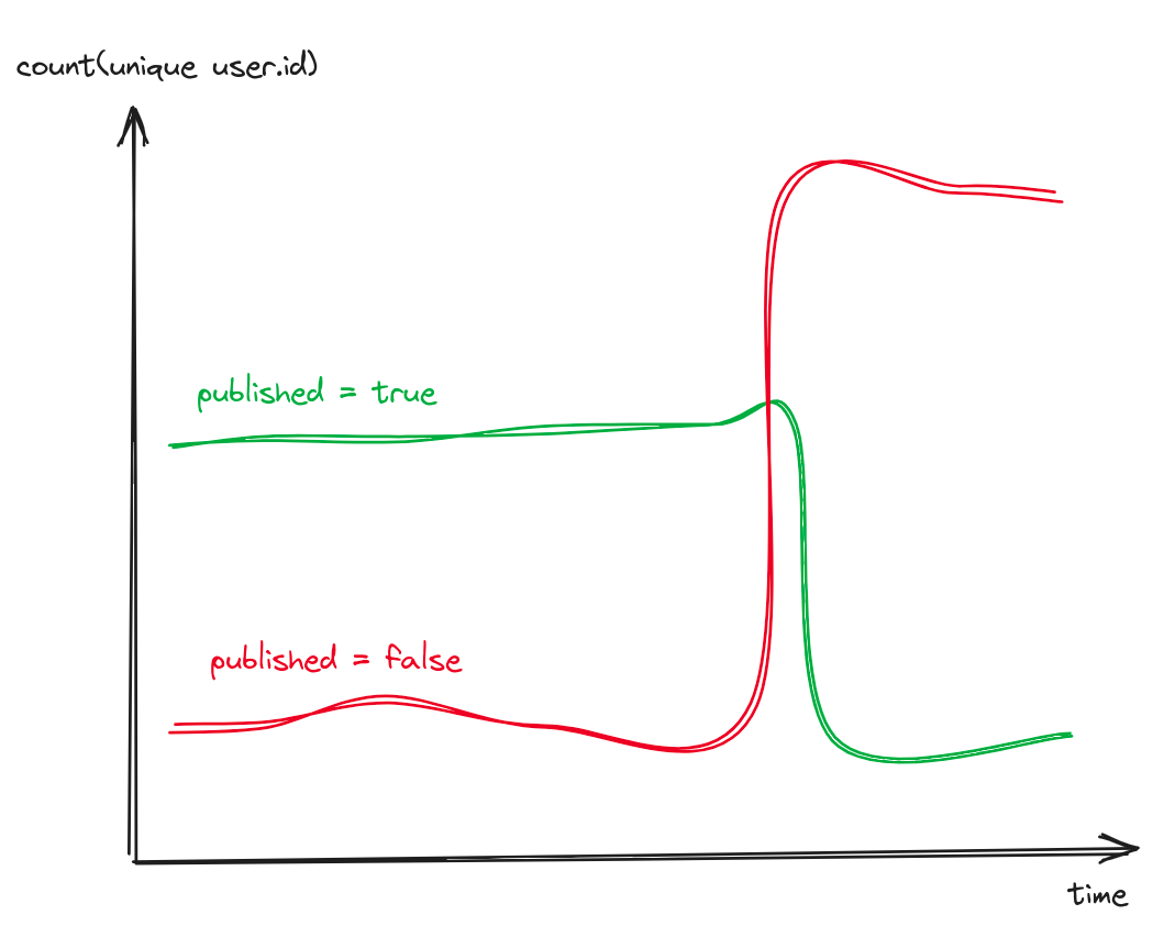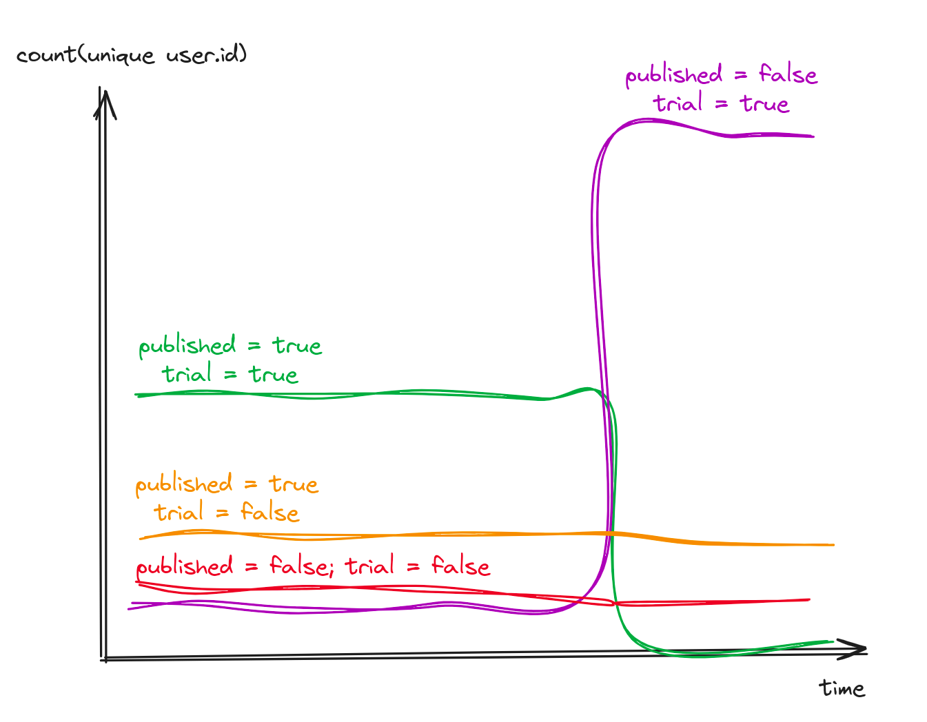 select count(unique user.id)from eventswhere method = "POST"and path = "/articles"and status_code = 201group by article.published, user.trial